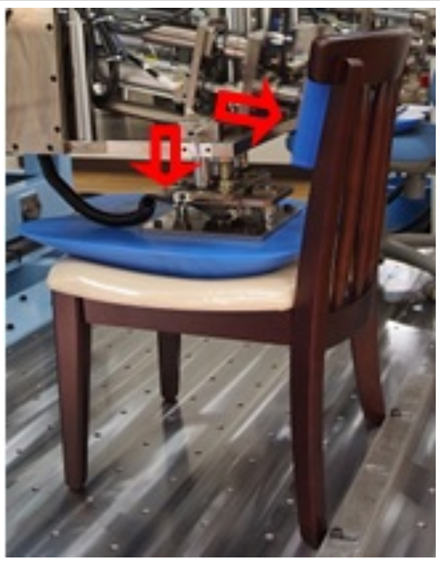 椅背/座面靜載荷強度測試:通過專用加載墊,將規(guī)定的載荷垂直于椅背/座面方向加載,并保持加載力一定時間,重復若干次。椅背、座面可單獨做靜載荷試驗,也可做聯(lián)合靜載荷試驗。