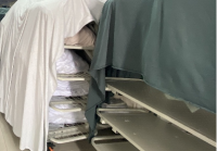 改善前: 驗布后的面料捆綁后在不平整的疊放狀態下進行松布,會導致面料褶皺彎曲,并且無防污的保護措施,沒有松布的時間管理。這些都會影響成品的縮率和形態,導致外觀不良。
