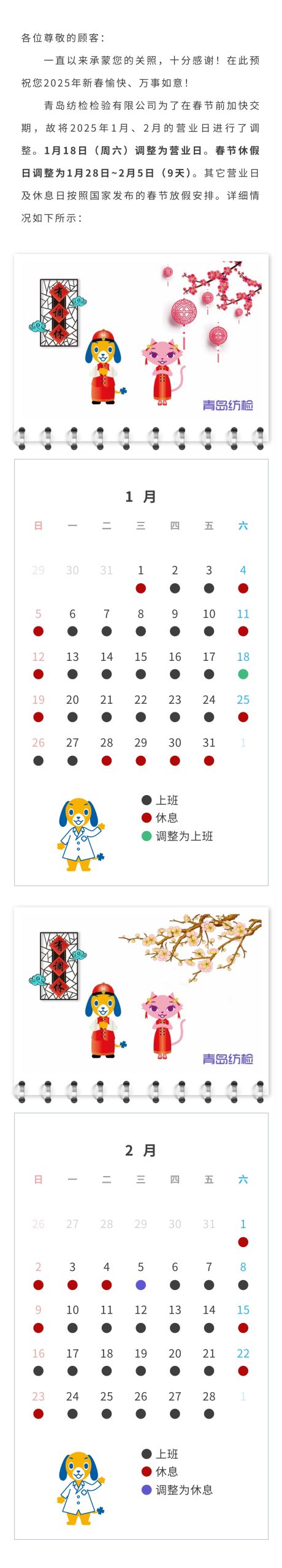 青島紡檢2025年1月~2月營業日一覽表